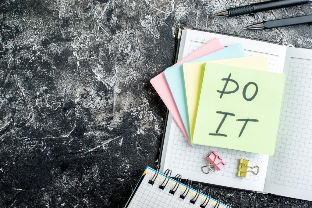 Plan, Do, Check, Act: Starte klein, teste, justiere. Zehn Minuten Bewegung täglich schlagen unregelmäßige Marathons. Eine Abonnentin notiert wöchentlich, was funktionierte, und passt ihren Plan an. Schreibe deinen nächsten PDCA-Zyklus auf und lade uns ein, dich in den Kommentaren anzufeuern.